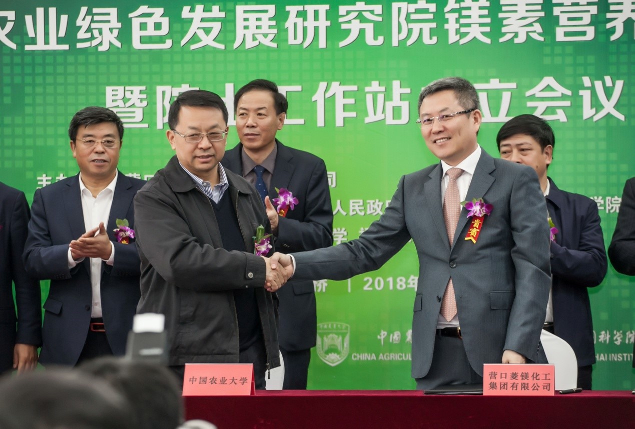 中國農業大學杜金昆、中國科學院青海鹽湖研究所吳志堅、營口菱鎂化工集團總裁車太龍共同簽訂了《國家農業綠色發展研究院鎂素營養研究中心合作協議》。中國農業大學杜金昆處長、營口菱鎂化工集團總裁車太龍簽訂《技術合作協議》。